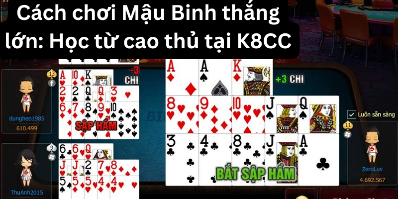 Trong cách chơi Mậu Binh thắng lớn: Học từ cao thủ tại Game bài trực tuyến tại K8CC, mậu binh là một trò chơi bài sử dụng bộ bài Tây 52 lá (không có Joker), nơi người chơi cần phải sắp xếp 13 lá bài thành 3 chi sao cho mỗi chi bài của mình có giá trị cao hơn chi của đối thủ. Mỗi người chơi sẽ nhận được 13 lá bài và phải phân chia chúng thành 3 chi bài: chi đầu (3 lá), chi giữa (5 lá), và chi cuối (5 lá).